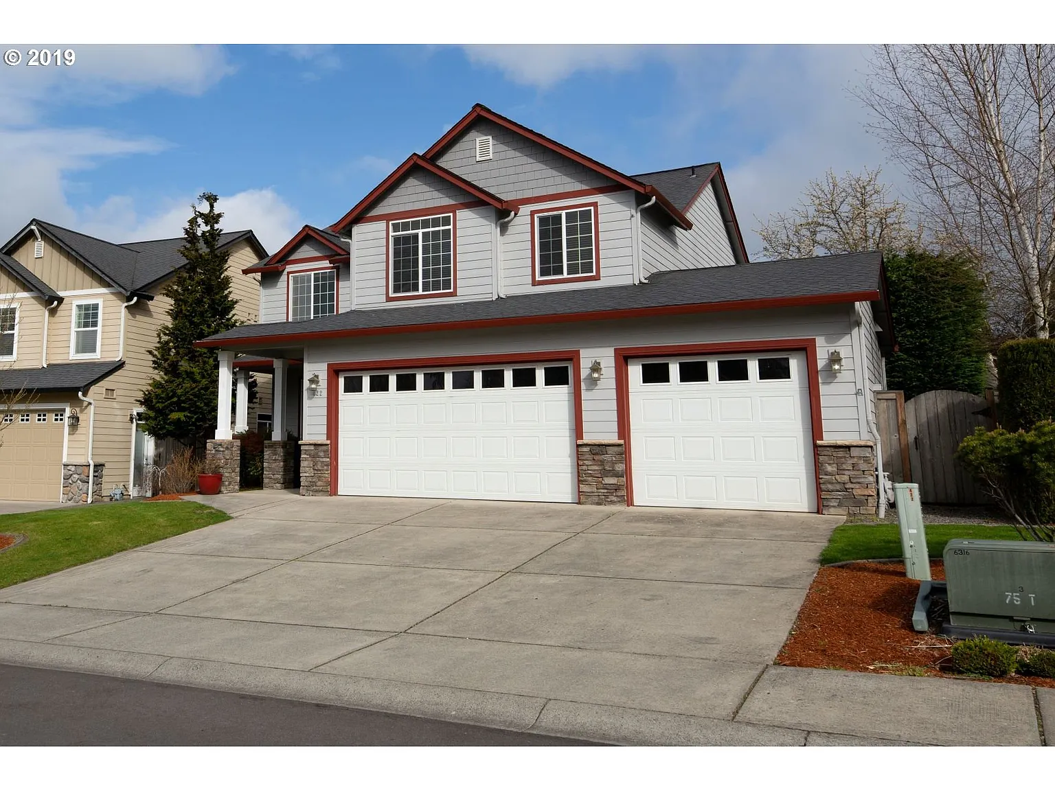 Location, neighborhood, former model home. Almost 2300 sqft, 3bdrm + bonus (or 4 bedroom, bonus has two closets), 2.5bath. Main floor office/den with french doors, great room concept w/ gas fireplace wrapped in wood mantle, open kitchen w/pantry. Hickory cabinets/trim, fenced backyard with large covered patio, outdoor fireplace and gate to path that leads to park and walking trails. Oversized three car garage and garden/tool shed.