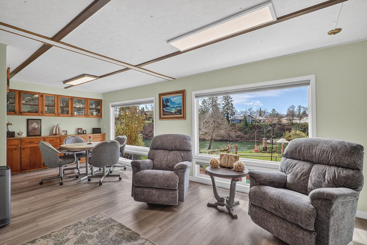 Imagine enjoying your morning coffee overlooking the Rogue River in your new home in Rogue Lea MHP a 55+ Community. This updated 3 bed, 1.5 bath, 1200 sqft home offers bright living spaces., a kitchen with white painted cabinets, the living and dining rooms with newer laminate flooring & large picture widows. Additional features include laundry closet, newer covered deck, single car garage, and low-maintenance landscaping with artificial turf. Space rent $1030. 2 park approved pets, and monthly income $3090.