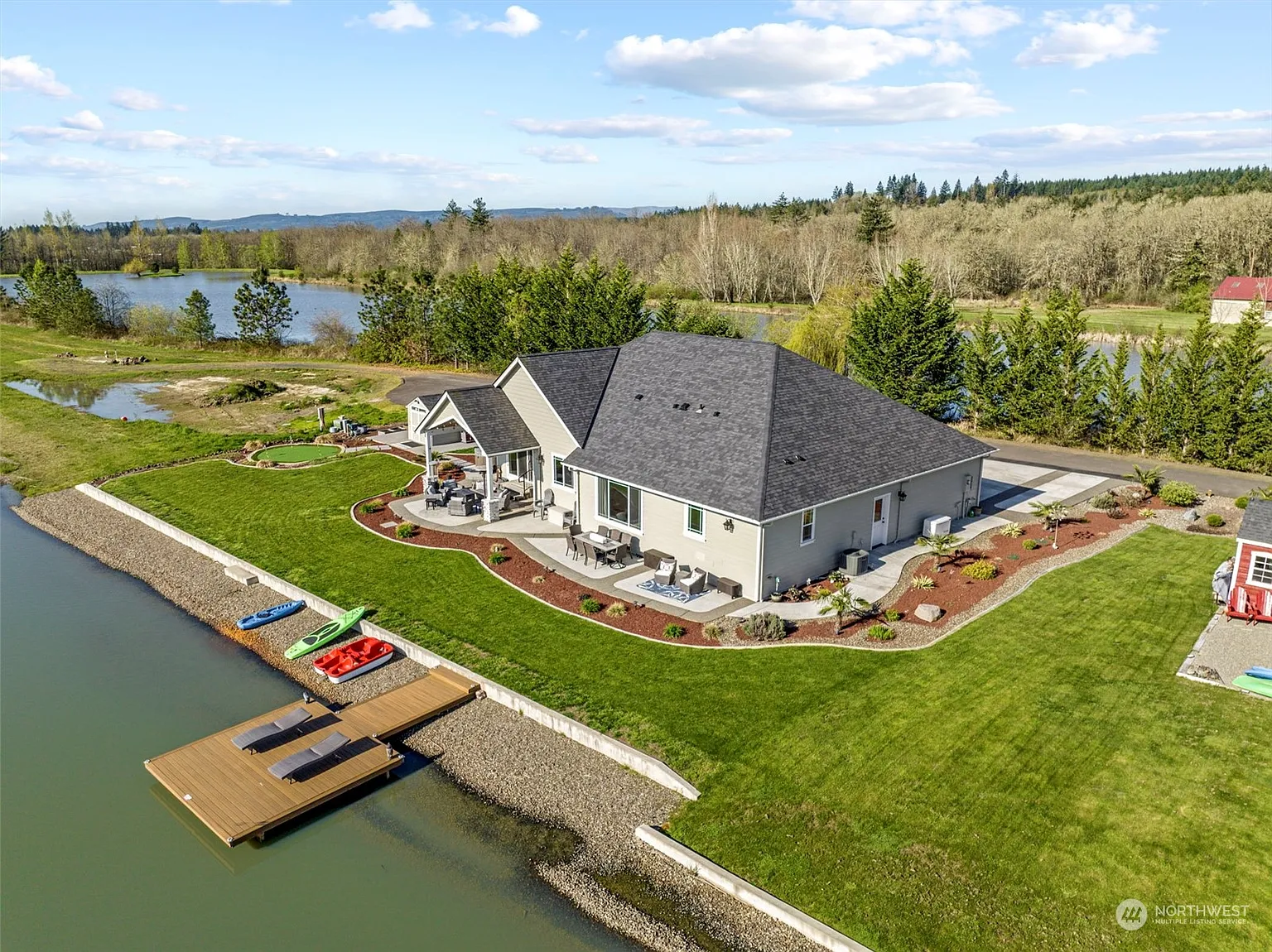 SELLER FINANCING AVAILABLE with large down. Stunning lake and mountain views in gated Winlock Waters community. Gorgeous landscaping, private dock, covered patio, putting green and open concept living. Enjoy waterskiing, paddle boarding, swimming, fishing, mountain bike trails, walking path and wildlife viewing all just outside your door. Neighborhood consists of 3 waterski lakes and amazing outdoor-living lifestyle. Reasonable HOA dues include water service and community septic system. Just a few minutes to I-5. Only 61 miles to PDX and 74 miles to Sea-tac! Did I mention the palm trees? This is paradise and a rare opportunity you won't want to miss! Property includes additional boat/RV storage and propane generator and heated garage.