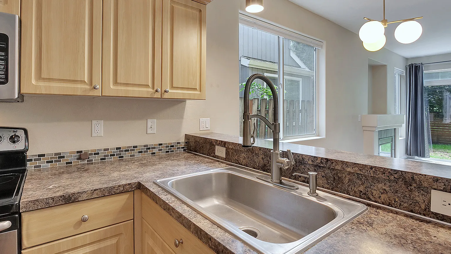 Make this your home. This split level house has a well-appointed kitchen with stainless steel range, fridge and dishwasher, and microwave. Other amenities include a master bedroom, gas fireplace in the living area, attached single car garage, washer/dryer upstairs, and a back lawn with patio. Home features solar panels and a smart Nest thermostat which translates into lower utility bills and helps the environment. There are three bedrooms on the second floor, including a master bedroom with generous closet space, an attached master bathroom with his-and-hers double sinks, and lovely green views of the park. Get all your laundry done in a snap with the convenient laundry room upstairs. Great location! Avoid the traffic and have an easy commute with easy access to I-5 via Columbia Blvd. walking distance to the MAX light rail. Also close to the popular St Johns and Kenton Neighborhoods with Farmers Markets, Coffee shops, neighborhood pubs, restaurants, and boutiques, and more.