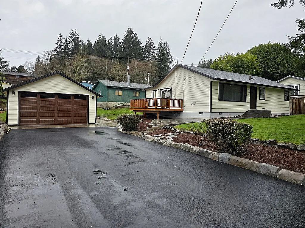 This newly remodeled home has 3 bedrooms, 1 bath. This beautiful house has new composition roof, paint (inside & out), bathroom vanity, LVT flooring in kitchen & oversized laundry room. The spectacular hardwood floors have been professionally sanded & refinished. The yard has established old growth trees, and a well manicured property. The newly built deck is perfectly placed for those summertime BBQ's. The detached 2 car garage was rebuilt 2025. All new siding, roof, drywall, paint (inside & out), with custom flooring and beautiful new garage door and lighting. The extra long driveway is new asphalt, and beautifully placed rock border also completed 2025. The driveway is long enough to accommodate several parking spaces or large motorhome, trailer, boat etc... This property is move in ready, so come take look, give me a call or stop in for the open house.