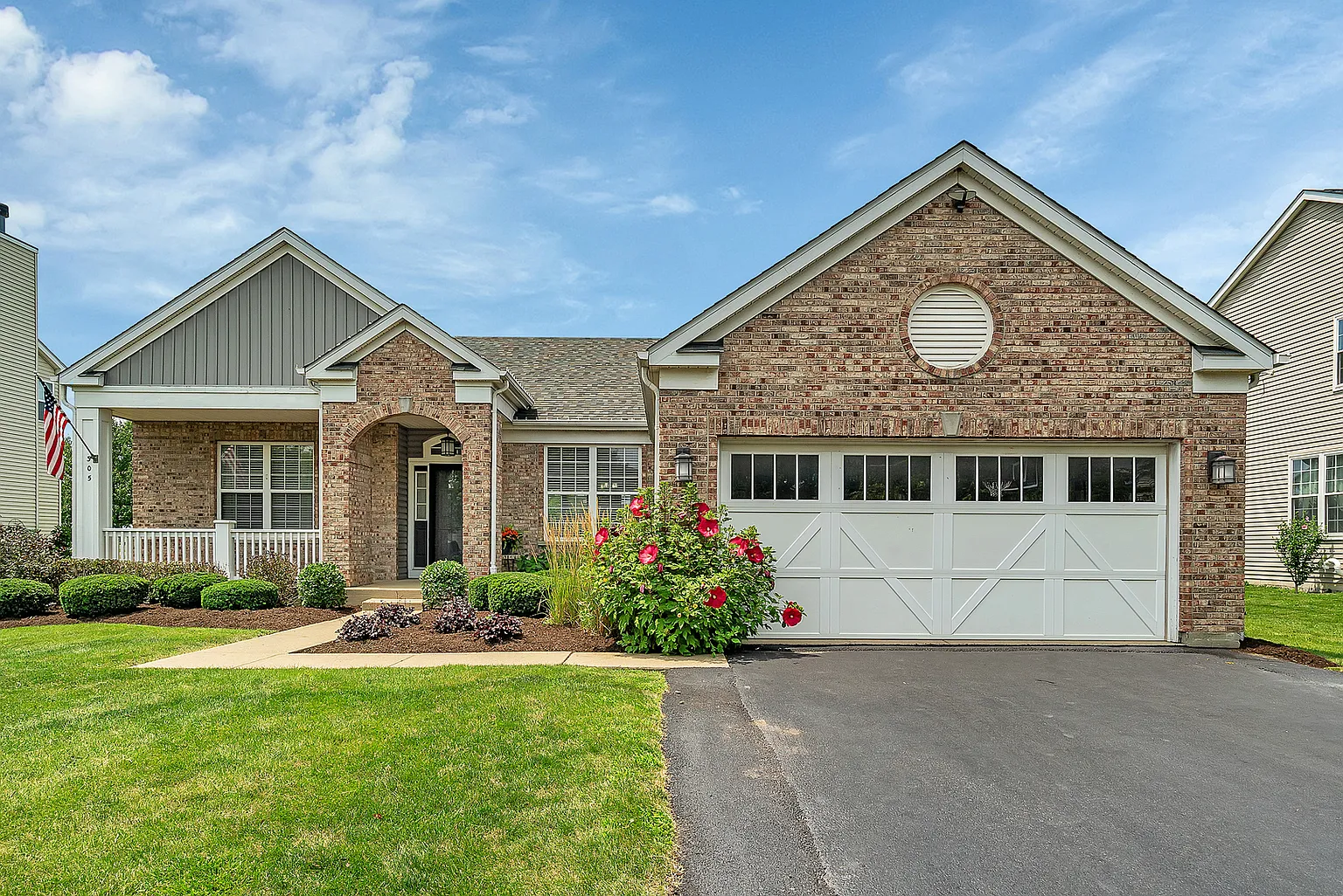 Ranch house with over 3500 sf of finished living space, decorated to the hilt! Absolutely stunning inside and out! A covered front porch greets you as you enter into a bright and wide open, functional layout. The main level features beautiful maple hardwood floors, newer carpet, vaulted ceilings, granite countertops, gorgeous cabinets, upgraded trim, master suite with separate tub and shower, double bowl vanity, laundry room, walk-in closet and two additional bedrooms. The newly finished basement has 2 generously sized bedrooms with a Jack-n-Jill bath and an 50x16 rec room that you can use in whatever way your heart desires. The privacy fenced yard features professional landscaping and a refreshing swimming pool! (Please do not jump in the pool until your offer is accepted.) There is also and enormous 50x18 stamped concrete patio! Perfectly located right across the street from Walnut Trails Elementary school and Four Seasons Park. No backyard neighbors! Walking distance to the Village Town Center and the planned YMCA. Low HOA fees and restrictions. Siding new in 2021. Roof and skylight new in 2015. Furnace 2021, A/C 2024. Water heater 2022. Sump pump 2020. Smoke and CO2 alarms replaced and updated in 2024. Front yard has sprinkler system.