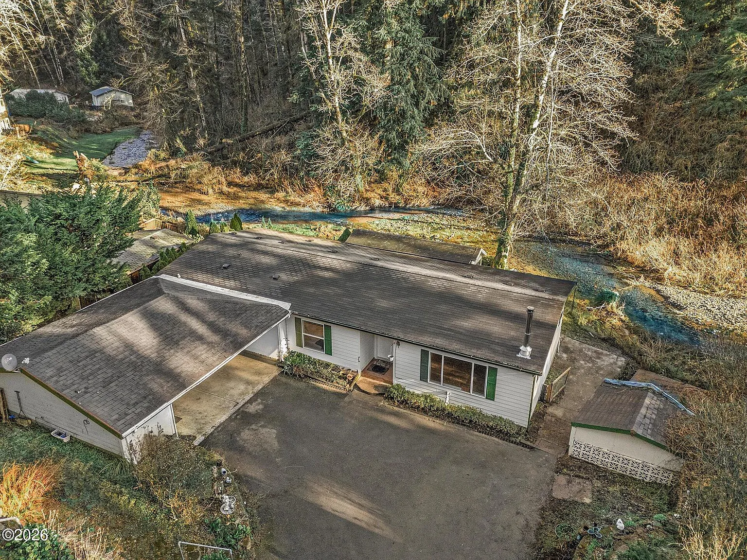 Price Reduced! Beautiful Creek frontage with easy water access, 2004 Manufactured Home sits on a quiet back street with a forest back drop, immerse yourself in creek-side living, Watch the water run over the rocks as the sun glistens off the surface. Sit back and wash the worries away. Peace and tranquility on the water. Spacious home with 1620 sq ft boasts 3 Rooms and 2 Bathrooms. Primary suite has its own bathroom with a walk in shower and Linen closet. walk in closet. 3rd room has no closet, w/ French doors. Large Kitchen with built-in Island and Pantry. Home comes with New wood stove with firewood in the shed. Oversized carport is a great space for covered parking, could be finished off to create a Garage. So much Potential. Truly a special setting. Upper part of the lot has additional Parking and Power to plug in on meter base. RV parking? Property has some terraced landscaping for additional retreat areas. Paved Driveway. Call today to ask to see this home! Easy to show and ready to go! Now is the time. Low down payment options available, call to discuss.