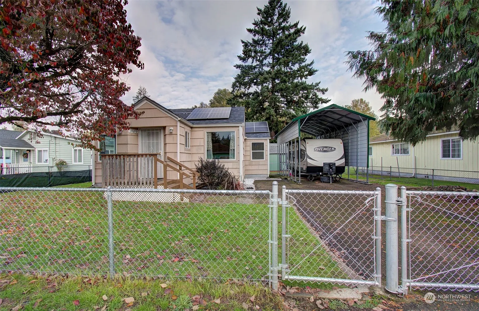 Welcome home to this bright and cheery bungalow in a prime location. Move-in ready with all appliances included, fully fenced yard with gated entrance, RV covered parking to protect RV or boat from the elements with dedicated parking space and electrical hook-up. Updated wiring, plumbing, flooring and roof in 2020. As a bonus enjoy energy savings and eco-friendliness with a fully equipped recently installed solar panel system. Brand new shed included for all your extra storage needs.