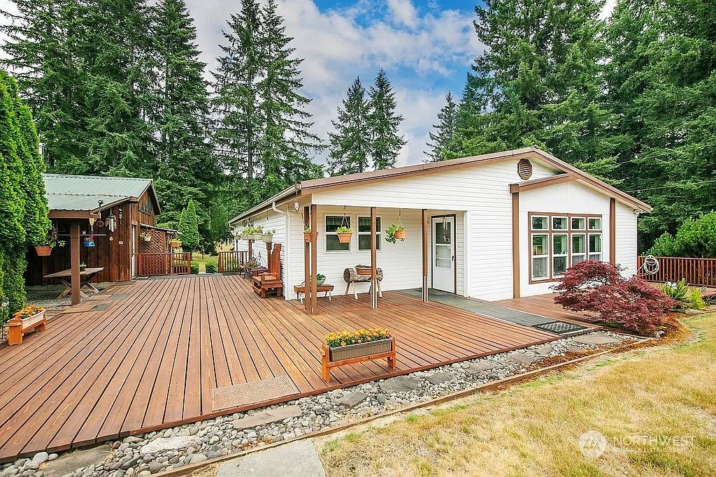 CASTLE ROCK Area -- Flat, Beautiful, Usable 1 Acre -- 3 Bedroom / 2 Bathroom -- 1884 Sqft -- Large Living Room -- Open Floor Plan -- Kitchen w/ Pantry, Island, & Stainless Appliances -- Primary Bedroom w/ Walk-in Closet & Full Bath -- 2nd & 3rd Bedroom have Walk-in Closets -- Laundry/Mud Room -- Vinyl Windows -- Vaulted -- Forced Air -- Lots of Natural Light -- Detached Double Garage/Shop -- Plus Double Carport -- Metal Roof -- Covered Deck -- Firepit -- Garden Space -- Landscaped -- Trees -- Covered RV Parking & Storage -- Easy Commute to I-5 -- Close to Year Round Recreation -- Fishing, Swimming, Boating, Hiking, Camping