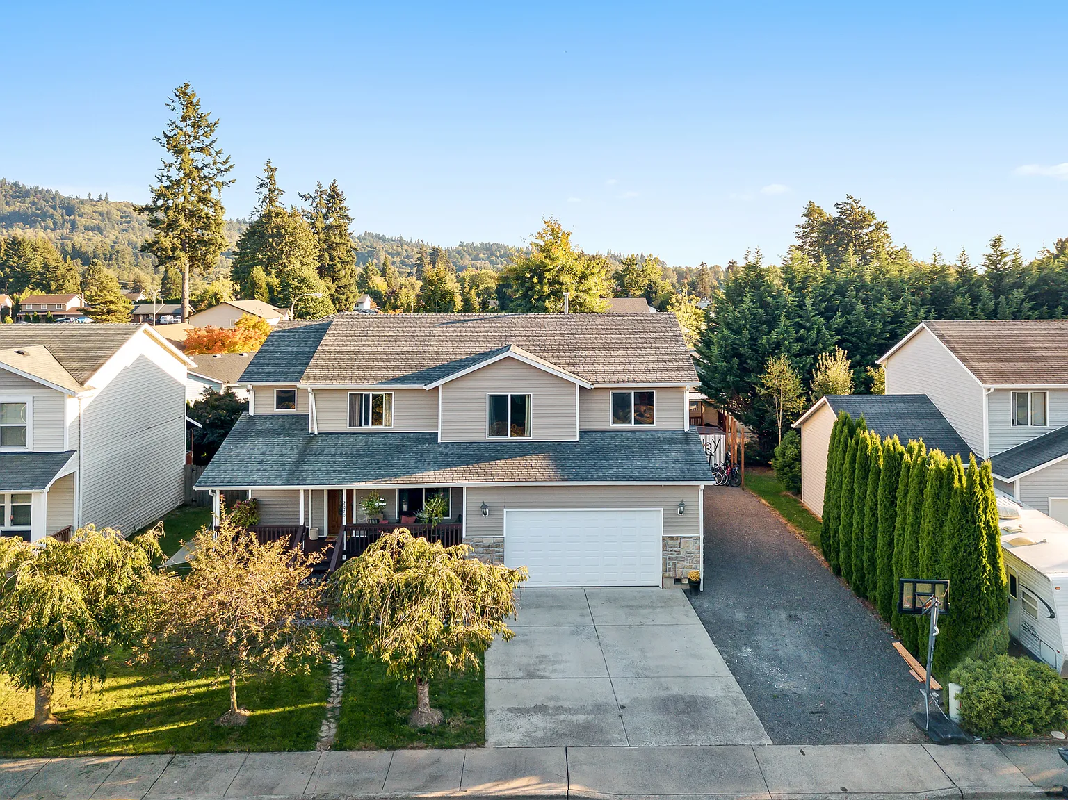Beautiful front porch invites you in to this large, 4 bedroom 2.5 bath home located in a great location! Only 2 miles from I-5 and 25 mins to PDX. RV parking w/electrical hookup! Quiet neighborhood with no HOA. Large, open kitchen overlooks the 14ft deck and boast lots of cabinets and counters. Huge master suite has updated bathroom with gorgeous tile and double pedestal sinks. Nice open loft, large laundry and extended garage!