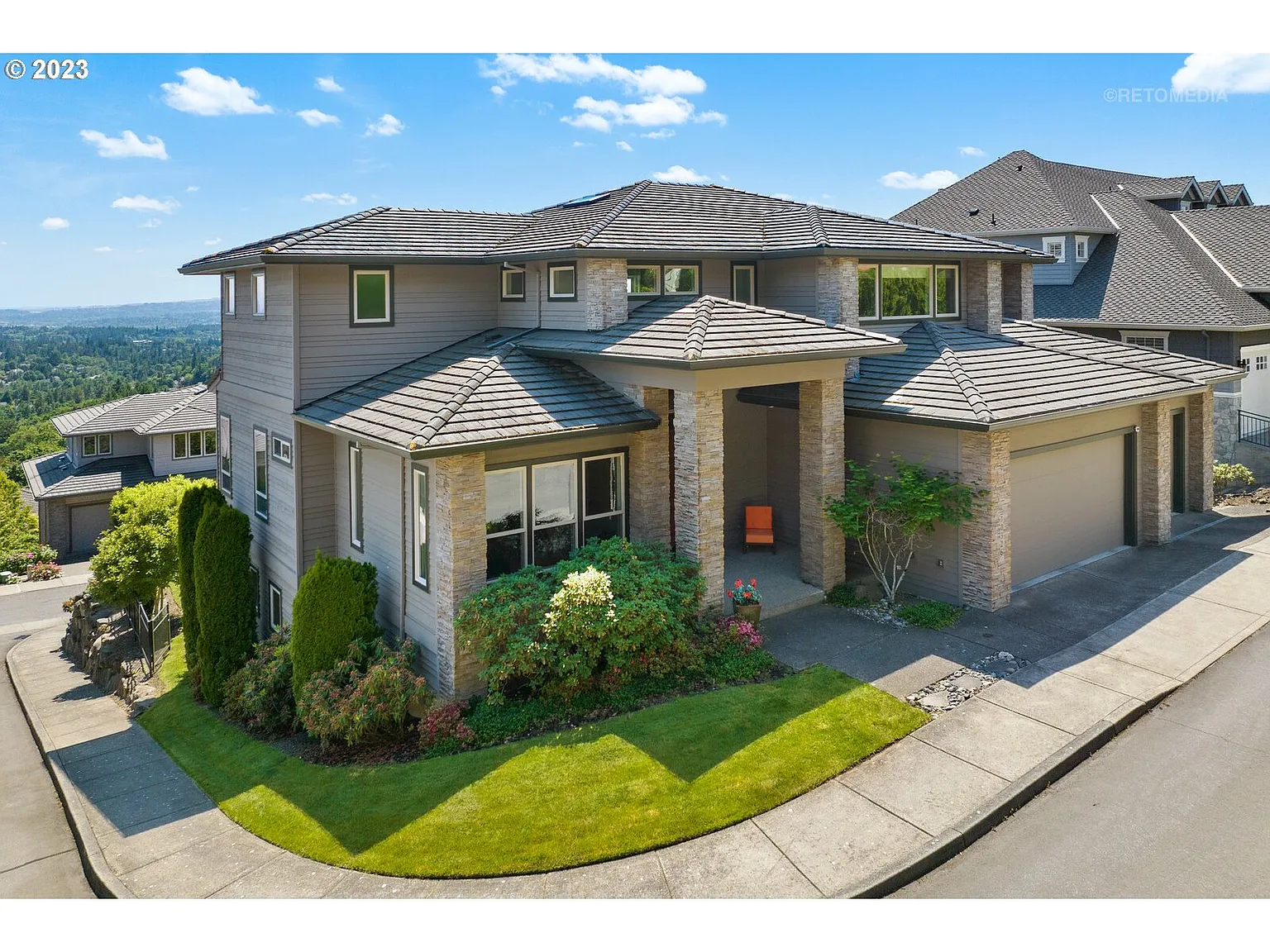 Stunning Forest Heights home offers expansive 270 degree south westerly views from 3 decks. Fenced in flat backyard approximately 80 x 30 ft with garden space! The kitchen is a chef's dream, offering a spacious open-plan layout and top-of-the-line amenities. Double ovens, double dishwashers, and microwaves, along with a 36-inch Sub-Zero fridge and freezer, provide everything you need to prepare and store culinary delights. The primary suite is a luxurious retreat, spanning approximately 1,000 square feet featuring stunning Calacatta marble. With four ensuite bedrooms, each providing a private haven, along with an additional guest room and a versatile exercise room that can easily convert into an extra bedroom, this house offers abundant space for family and guests. You'll find convenience and practicality throughout. Expansive laundry and craft room with walk in storage, custom pass through to primary closet for easy laundry transfer. Pre-plumbed for wet bar in lower family room nook and also pre-plumbed for garage utility sink within built in cabinetry if desired. Practical features include a central vacuum system and a large crawlspace dry storage area with a built-out plywood platform floor, providing ample space to keep your belongings neatly organized and easily accessible. Relax and unwind in the hot tub on lower deck with an enclosed ceiling.Short commute to Nike, Intel, Westside hospitals, Beaverton and downtown PortlandMinutes to access extensive Forest Park trails. [Home Energy Score = 1. HES Report at https://rpt.greenbuildingregistry.com/hes/OR10207101]