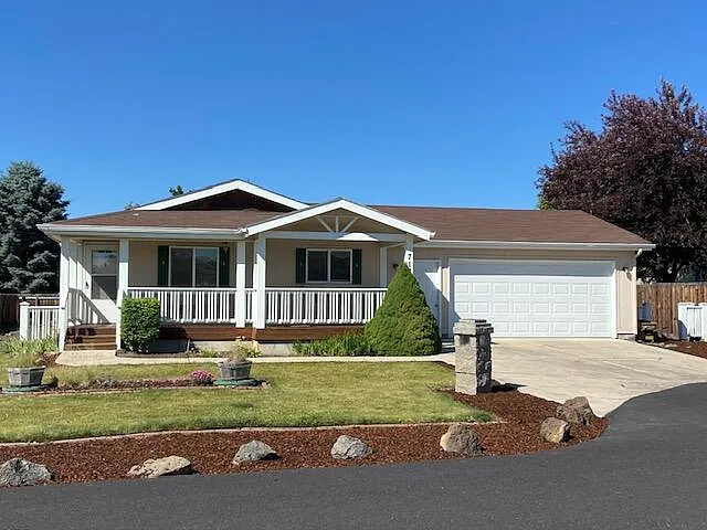 Cute one owner Fuqua manufactured home located in NE Redmond close to shopping, restaurants, and medical facilities. The interior of the home has just been painted, and the exterior was painted within the last few years. The kitchen cabinets are oak, there is a breakfast bar plus an eating area, 3 bedrooms (one bedroom w/French doors could be formal dining or office) and 2 bathrooms. Underground sprinklers front and back with backyard area ready for gardening, oversized finished 2 car garage with man door leading to backyard courtyard & gardening nook, plus additional man door leads to finished 14' x 24' attached shop. A must see! This home is located in the Desert Meadows HOA with yard irrigation water included in the HOA dues.