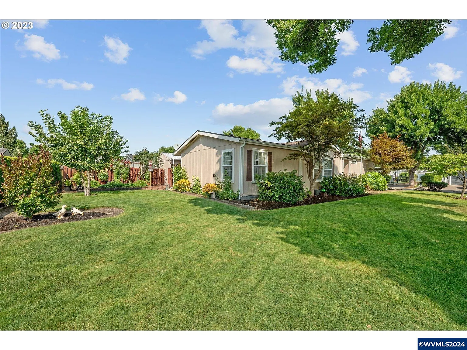 Prime corner location in Meadow Creek 55+ park. Vaulted, bright and spacious LR opens to the dining space. Nicely appointed kitchen w/tons of storage + an eating bar island. All appliances and included! Laminate floors run through the utility, kitchen & dining! Lovely primary features a spa like bath w/soaking tub & double sinks! Fenced garden spot & a shop space with a sawdust vac system! RV parking at the park plus a clubhouse! Beautiful landscaping!