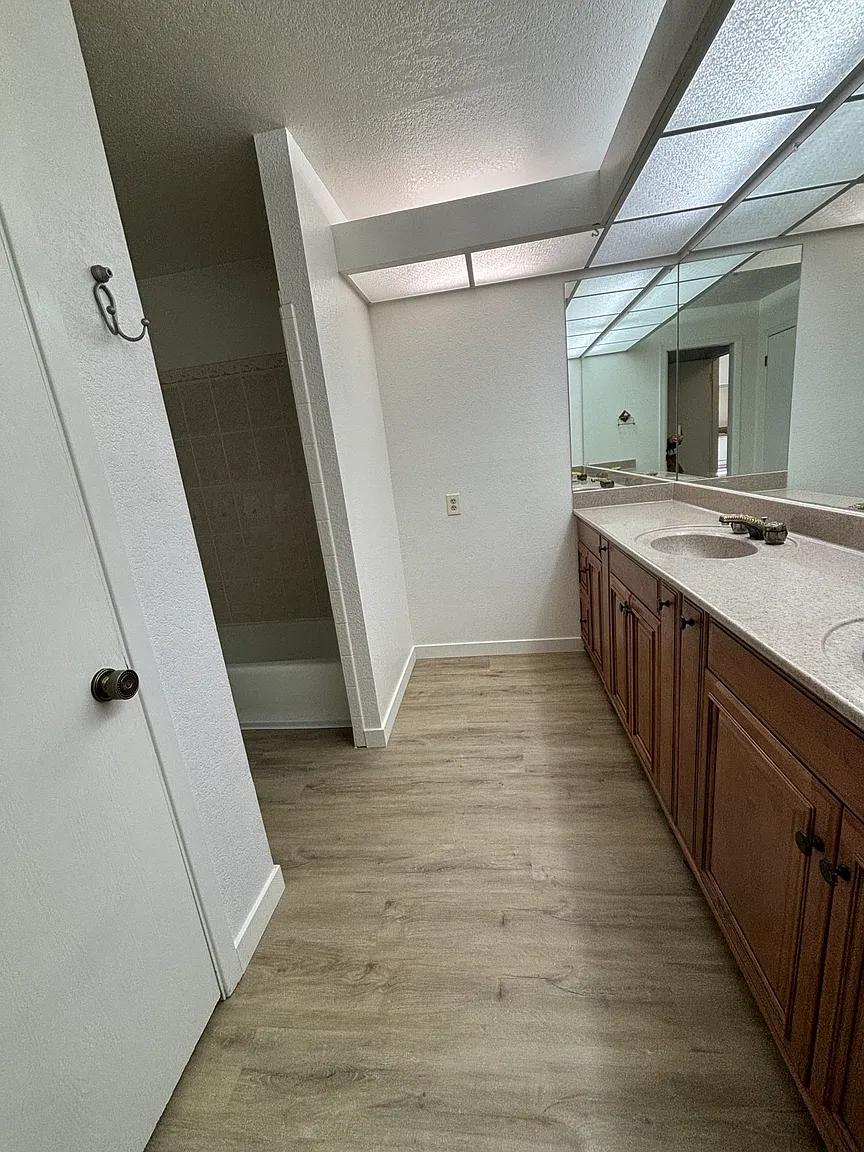 Home is spacious with high ceilings and open beams. Private fenced yard. Beautiful new LVP flooring throughout. 2 car garage and ample closets. Community has a pool and tennis courts. One year lease (to start). Pets upon approval.