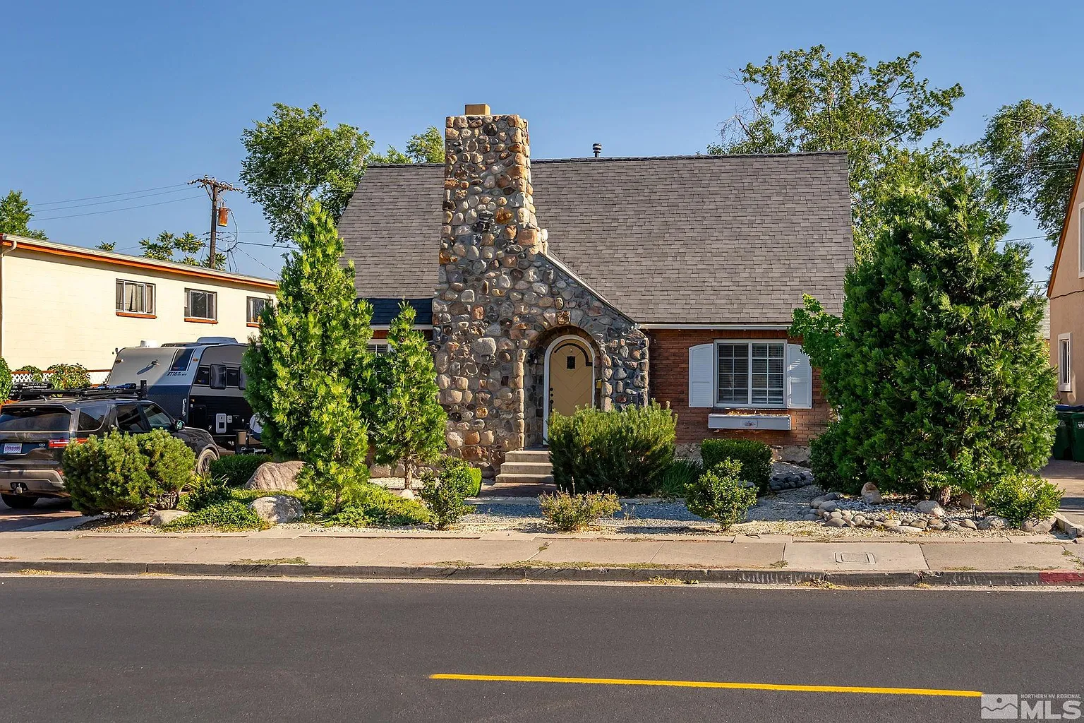 Mid-century cottage in the heart of Mid-town Reno! Beautiful stone and brick home with extensive upgrades. Great location boasts walking distance to great restaurants, bars, cafes and businesses. You'll notice the signature stone fireplace and chimney along with a mid-century classic arched doorway! Interior of home has been completely remodeled, including all built-in appliances in the kitchen, remodeled bathroom on main level, and a primary bedroom and bathroom added to the second level., The full stone-walled basement is unfinished, yet perfect for a shop, crafts, or playroom! The 2 car detached garage is currently used as a large shop, complete with interior lighting and skylights. Enjoy the beautiful oasis of a backyard, right in the middle of mid-town Reno. This home is zoned mixed use which opens up many other possibilities. So many beautiful, charming aspects to this home, you must see it to believe it! Open House on Saturday July 20th from 10am to 2pm!