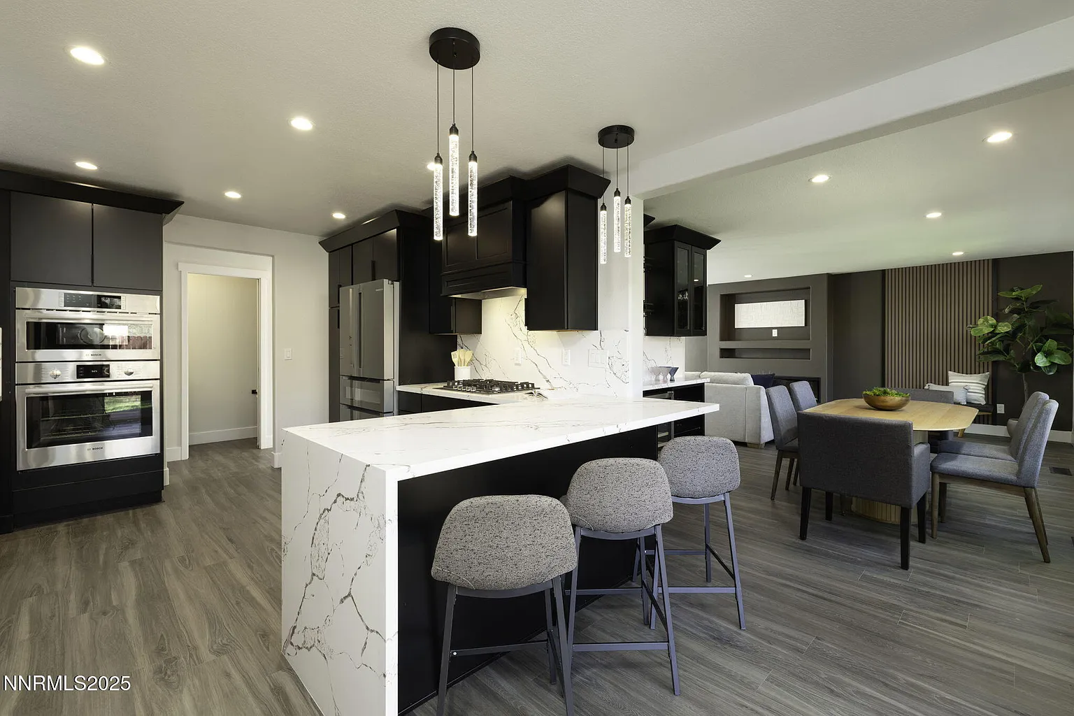 Our analysis highlights cohesive design, stylish pendant lighting, and sleek black cabinetry as key attractions of this home.