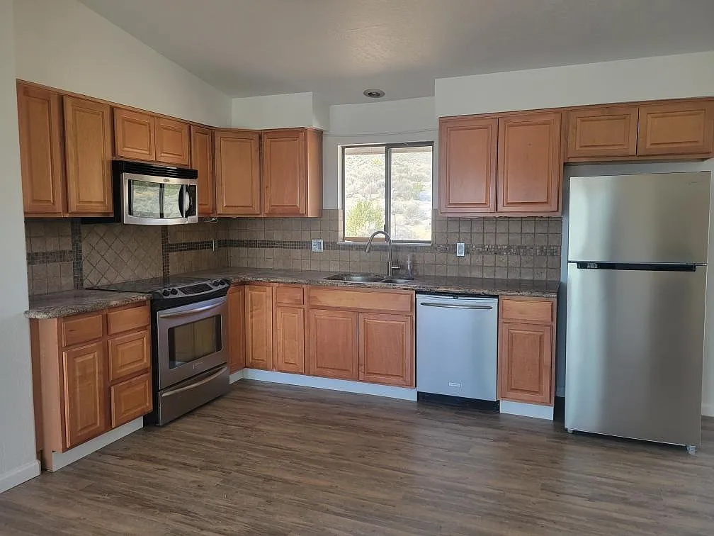 Endless views of mountains and valleys! The 2nd story of this 2 bedroom, 2 bath home is waiting for you. Private entrance. This quiet home has new carpet, fresh paint, new mini splits, spacious living room with fireplace, a private entrance, and a large deck. Kitchen includes gas stove, dishwasher, garbage disposal, built in microwave and a new refrigerator. Very private setting yet only a short distance to shopping, schools and freeway access. Property backs up to BLM land. Tomahawk Way is a solid dirt road. Dirt driveway. No garage. Covered parking. Owner pays trash. Well water and septic. No smoking. No pets. Applicant Screening and Background Check $30 per adult.