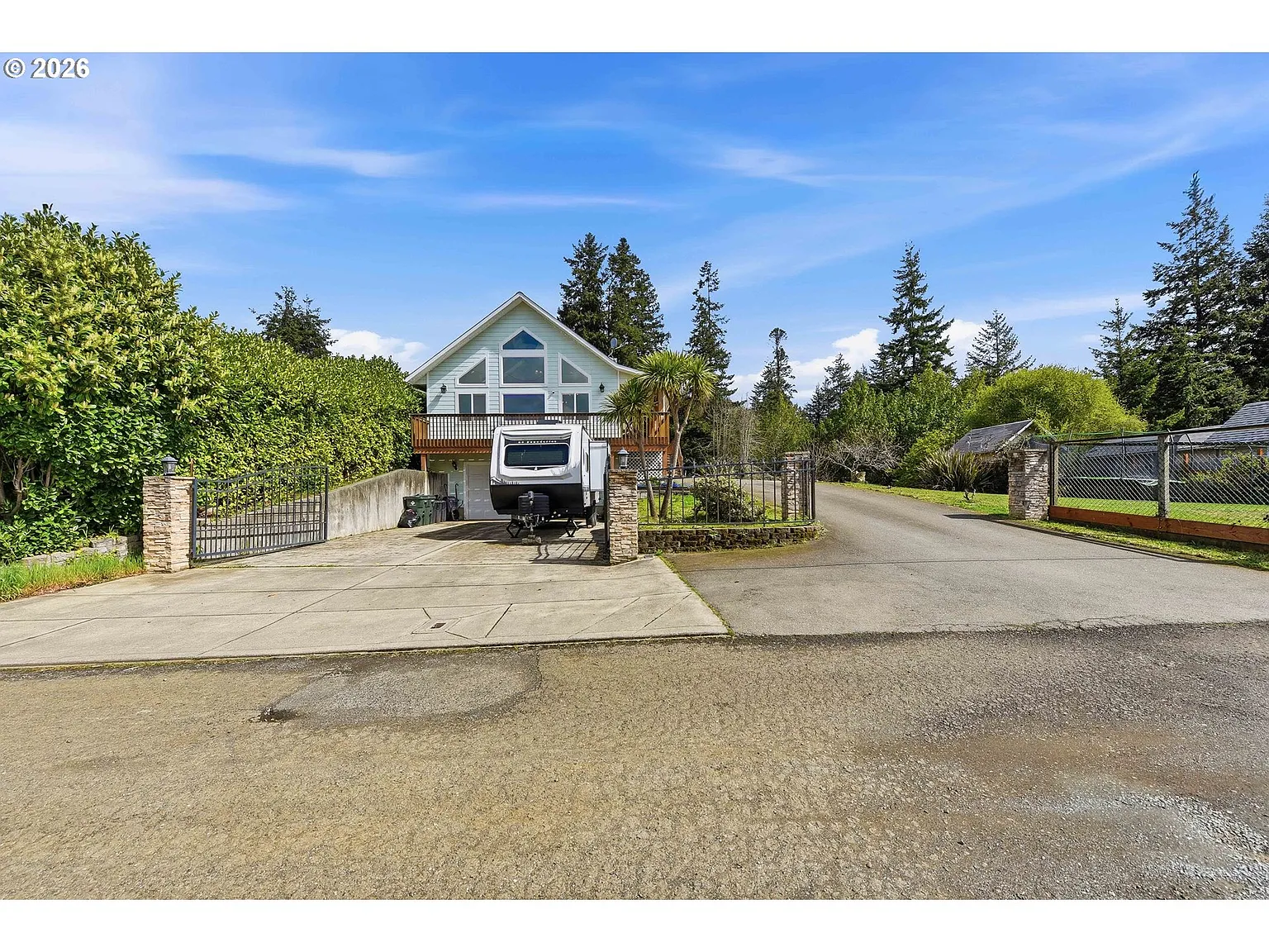 Perched on an estate-quality .95-acre parcel with beautiful valley views, this impressive modern home in Coquille offers the complete package. From the oversized shop, paved driveway to the gated entry, this property combines functionality, space and comfort in a hard-to-find setting. Offering 4 bedrooms, 3 bathrooms and a versatile layout, there is room here for a variety of living needs. Inside, the home features vaulted ceilings, picture windows, a soapstone woodstove and an open-concept layout that feels spacious and inviting. Recent upgrades by the current owners include all new LVP flooring in main areas, including carpet in 3 bedrooms, a full kitchen remodel, a brand-new heat pump and the addition of a dedicated laundry space in the garage with extra storage. The main level includes 2 bedrooms and 2 bathrooms, including the primary suite with a sliding glass door leading to the back deck. The en-suite bathroom features a double sink vanity and walk-in shower. Upstairs, you’ll find a loft-style bedroom and an additional flex space currently being used as an office, with balcony that overlooks the living area below. Downstairs, the oversized 4th bedroom is a standout feature with its own exterior access, abundant storage and a private bathroom built in 2024 with a walk-in shower. This space is large enough to serve as a second family room, guest quarters or possible dual living setup. Outside, the property continues to impress with an expansive deck, fruit trees, fully fenced backyard with gate and a small creek bordering the property. One of the biggest highlights is the large shop, with the driveway extending all the way down to it and room for multiple vehicles, RVs, boats, toys, or hobby space. The property also features full RV hookups in the front driveway, adding even more convenience and flexibility. With a double garage, gated entry and so much usable space both inside and out, this is a truly well-rounded property with a lot to offer. A must see!