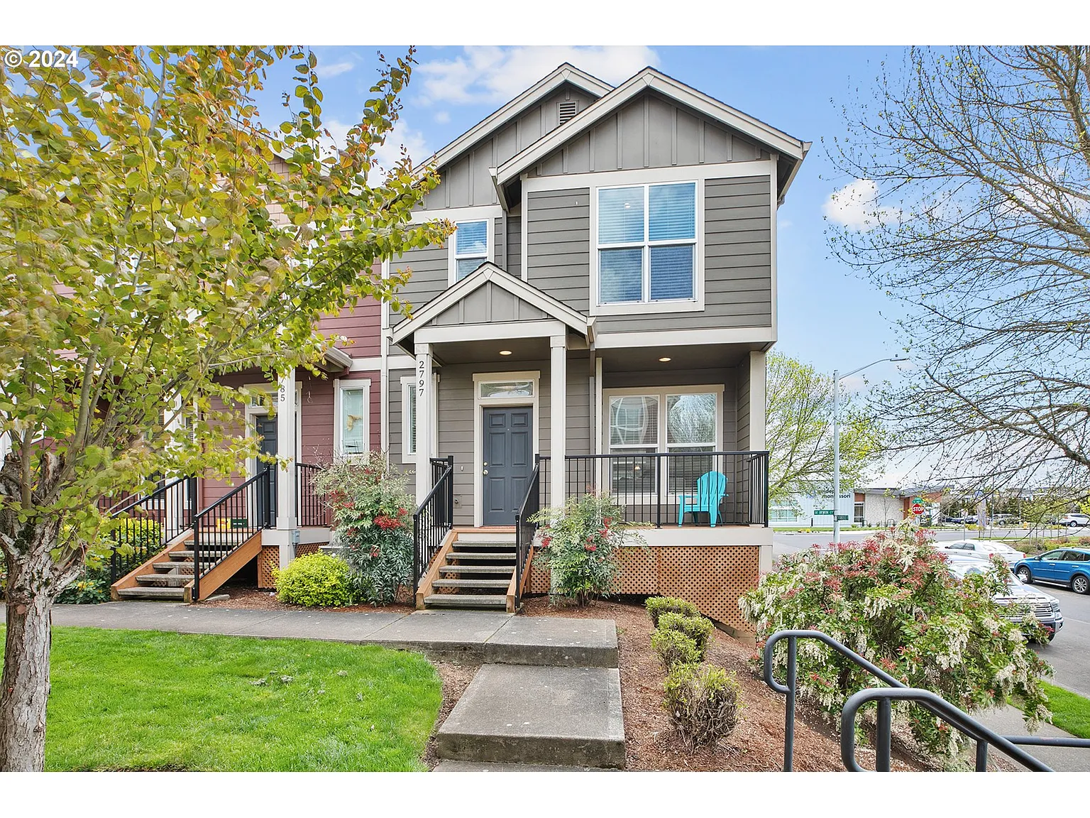 Charming End Unit Townhome. Enjoy the open concept main level full of windows & light while you relax by the living room fireplace. The spacious kitchen opens to the dining room & to the living room & features slab granite counters, an island, gas range & built in microwave & dishwasher. The dining room includes built in shelves & leads to the back deck. Upstairs includes the primary ensuite with vaulted ceiling & walk in closet plus two other bedrooms with vaulted ceilings, a hall bath & laundry. The lower level is perfect for an office, playroom, or potential extra bedroom & has laminate wood floors. Relax on the covered front deck & view of greenspace. Super convenient location near shopping, restaurants, & movie theater. Attached side by side 2 car garage. New paint & carpeting throughout. New stove to be installed prior to closing. [Home Energy Score = 7. HES Report at https://rpt.greenbuildingregistry.com/hes/OR10226914]