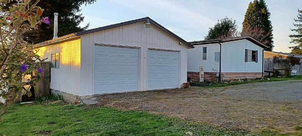 Sunny .44 acre property with 1977 mobile home, 2 bedrooms 2 bathrooms. 2 car garage with electric door openers. Garage has a bonus room, as well as attached shop. Mature fruits trees: kiwi, apple, pear, plum, plus additional room for vegetable or flower garden.