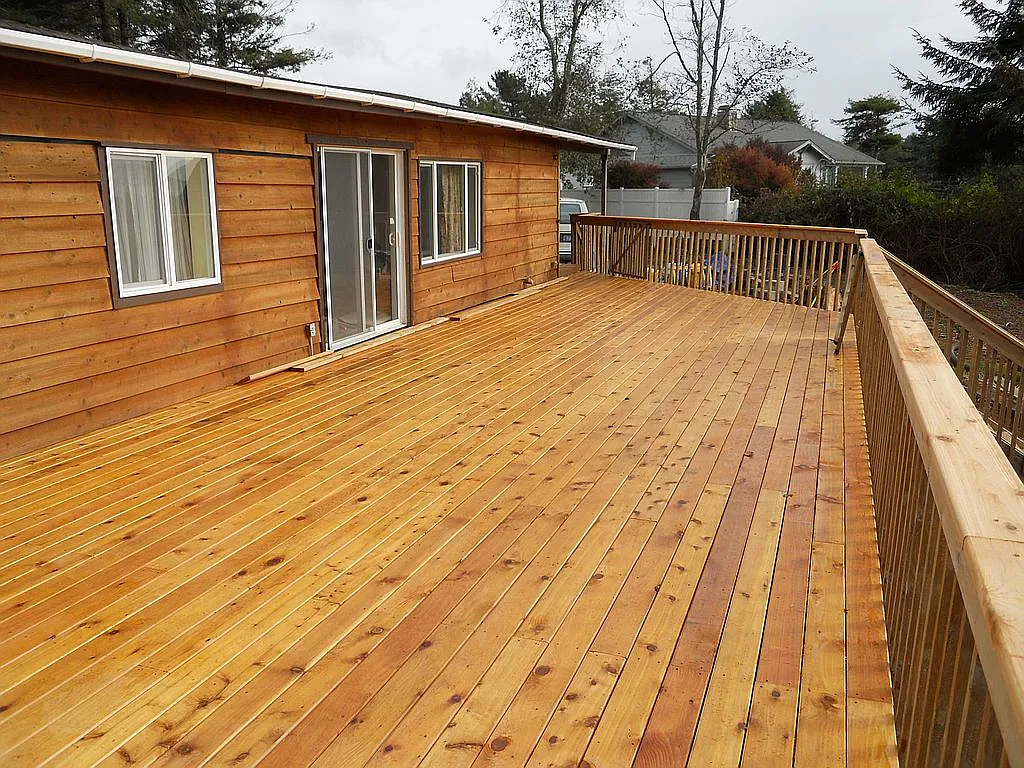 This is a single wide mobile home with and addition that makes it into a double wide which makes the total square footage 1150 sq ft. It is enclosed in cedar siding and pitched roof and it looks like a really neat cedar cabin. It is 80% sheet rocked inside. All the flooring is new in 2011-12. The bathroom is all new too. It is a comfortable home and has a nice ocean view - you can see ocean from inside the home. The deck has been replaced and looks great approx 16 ft by 46 ft so large. There is one full bathroom and one half bathroom. There is a large bedroom on one end of home and one bedroom with the half half on the other end of home. The third "bedroom" is small and we used it as an office. It does not have a built in closet in this room. But it does have an ocean view from this room. It makes a very pleasant office. Neighborhood Description Good quiet neighborhood. Safe and