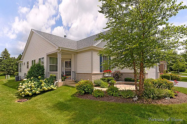 Immaculately kept 2 bedroom, 2 bath home with tons of natural light on a premium lot in desirable 55+-community with pool, clubhouse and tennis courts! Home boasts 2 large bedrooms, den, huge eat-in kitchen featuring white cabinets, beautiful granite countertops, sunroom, huge full basement, crown molding throughout, beautiful brick surround fireplace, large master bedroom, walk-in closet and master bath (handicap equipped) 2-car garage, private bermed yard with patio, sitting wall in front of the home, close to I-88 and Metra! This one is a must see! 1-year home warranty.